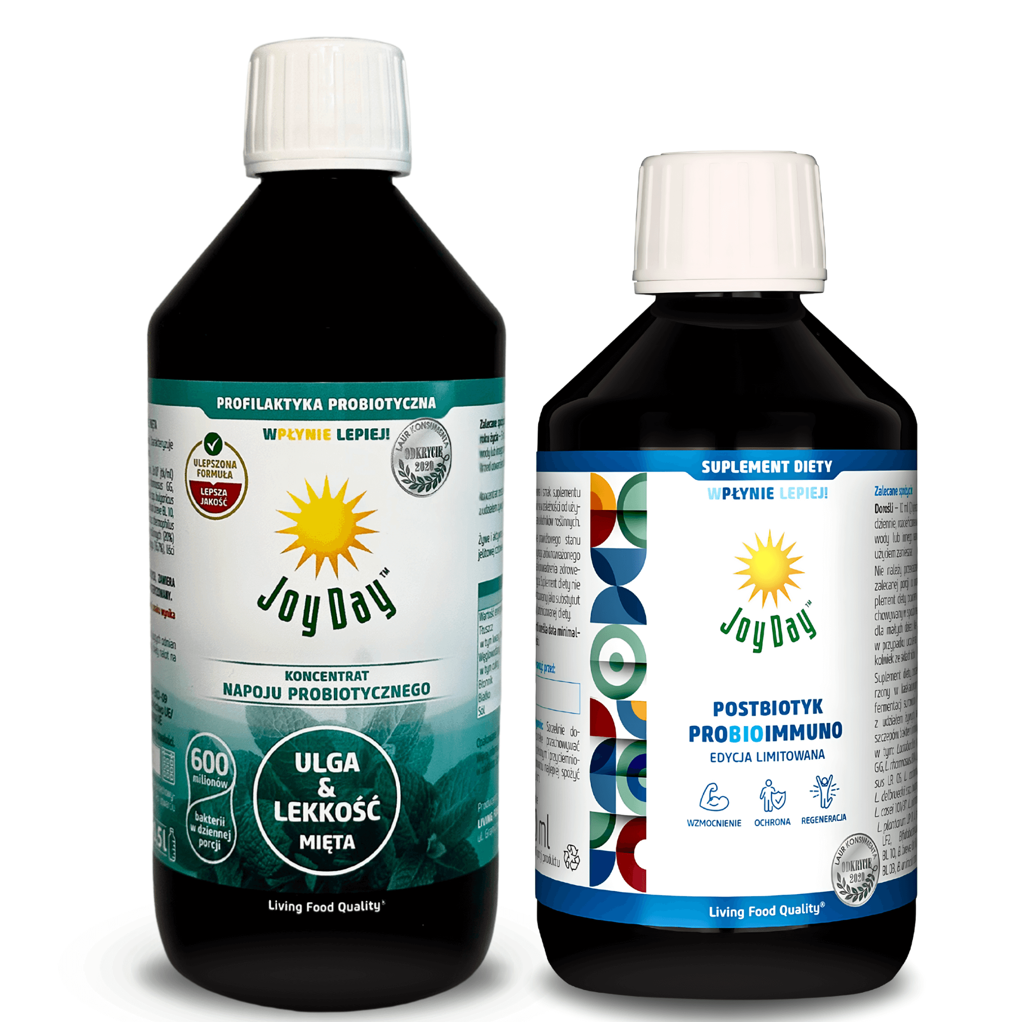 Składniki Koncentrat napoju probiotycznego Joy Day Mięta: Aktywne szczepy bakterii probiotycznych (min. 2×10^7 jtk/ml) w płynie postbiotycznym (80%) [woda ryżowa, Lactobacillus rhamnosus GG, L. rhamnosus LR 04, L. rhamnosus LR 05, L. acidophilus LA 1, L. delbrueckii ssp. bulgaricus LB 2, L. casei 101/37, L. plantarum LP 02, L. plantarum LP 01, Bifidobacterium breve BL 10, B. breve Bbr 8, B. longum BL 03, B. animalis ssp. lactis Bi 1, Streptococcus thermophilus FP4, S. thermophilus 9 Y], ekstrakt z fermentowanych składników roślinnych (20%) [w tym z: liści mięty (23,3%), kwiatów czarnego bzu (20%), kwiatów głogu (16,7%), liści melisy (16,7%), kwiatów lipy (13,3%), ziela skrzypu polnego (10%)].